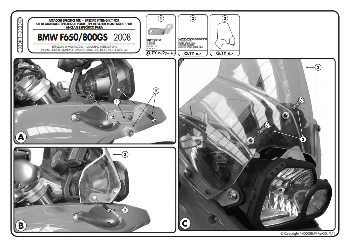 Dedykowany kit montażowy, który umożliwia zamocowanie szyby Givi 333DT do motocykla BMW F 650 GS / F 800 GS (08-17).