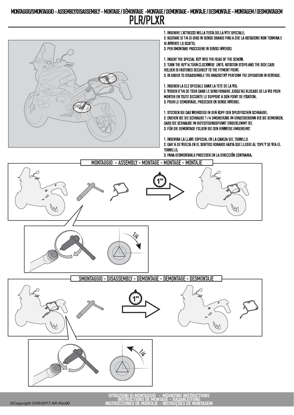 Stelaże PLR czyli w systemie Rapid release umożliwiają szybki demontaż stelaża z motocykla za pomocą kluczyka dołączonego w zestawie. Cała operacja trwa nie więcej niż minutę, a na motocyklu zostaje sama baza stelaża, która nie rzuca się w oczy.
