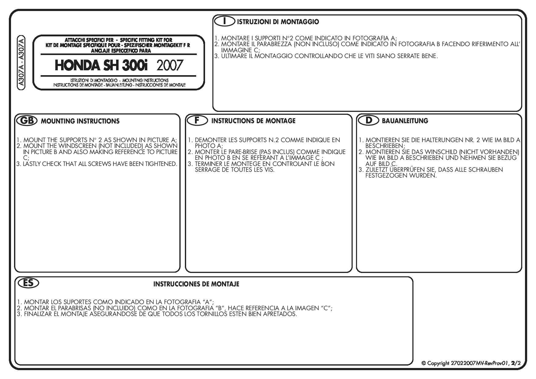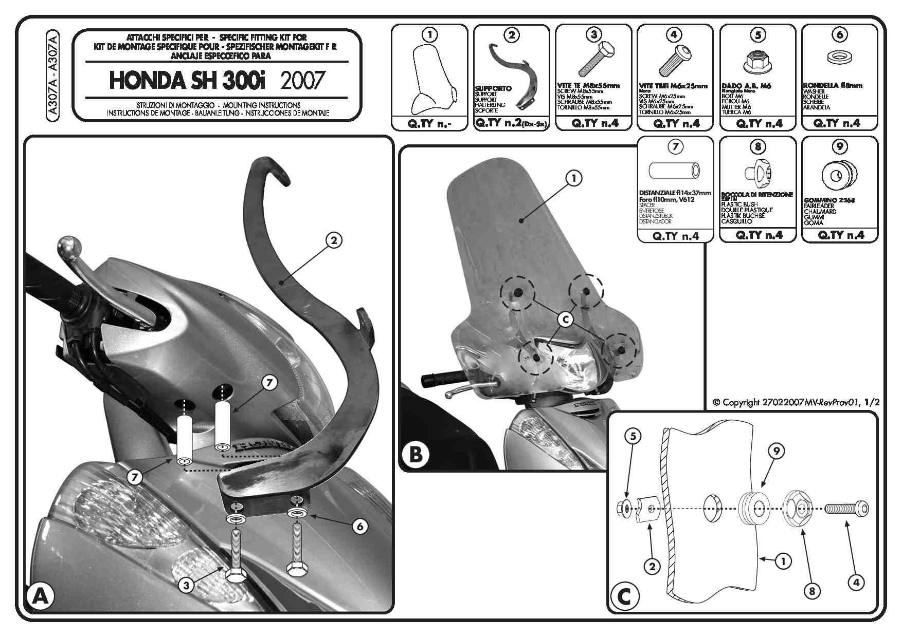 Dedykowany kit montażowy, który umożliwia zamontowanie szyby Givi 307A oraz 308A na skuterze Honda SH 300i (07-10).