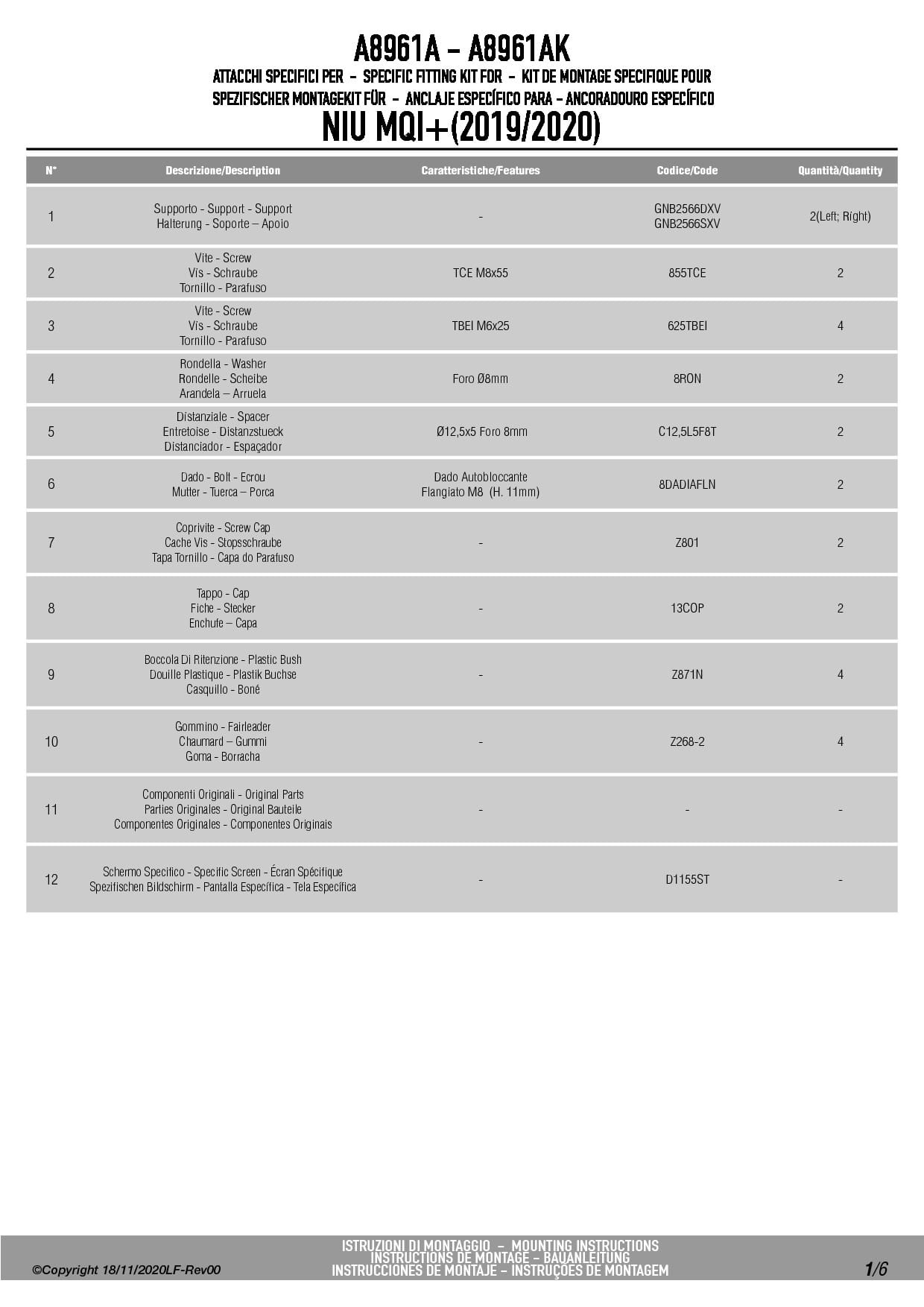 Dedykowany kit montażowy, który umożliwia zamocowanie szyby Givi D1155ST do skutera Niu Mqi+ (19-23).