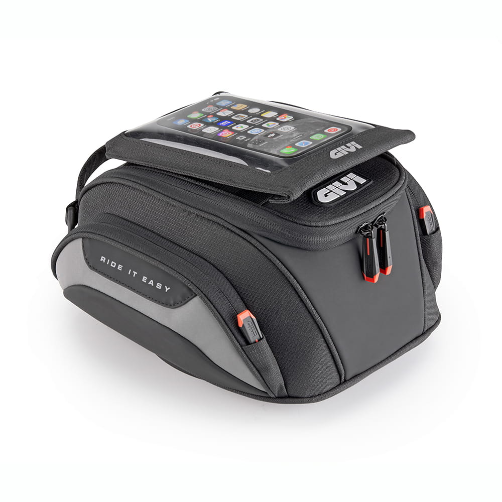 Givi EASYSH (widoczny na zdjęciach) to kompaktowy, funkcjonalny i estetyczny dodatek, który znacząco podnosi komfort jazdy i organizację przestrzeni na torbie zbiornika paliwa. Etui nie jest wyposażeniem standardowym torby i można je dokupić osobno.