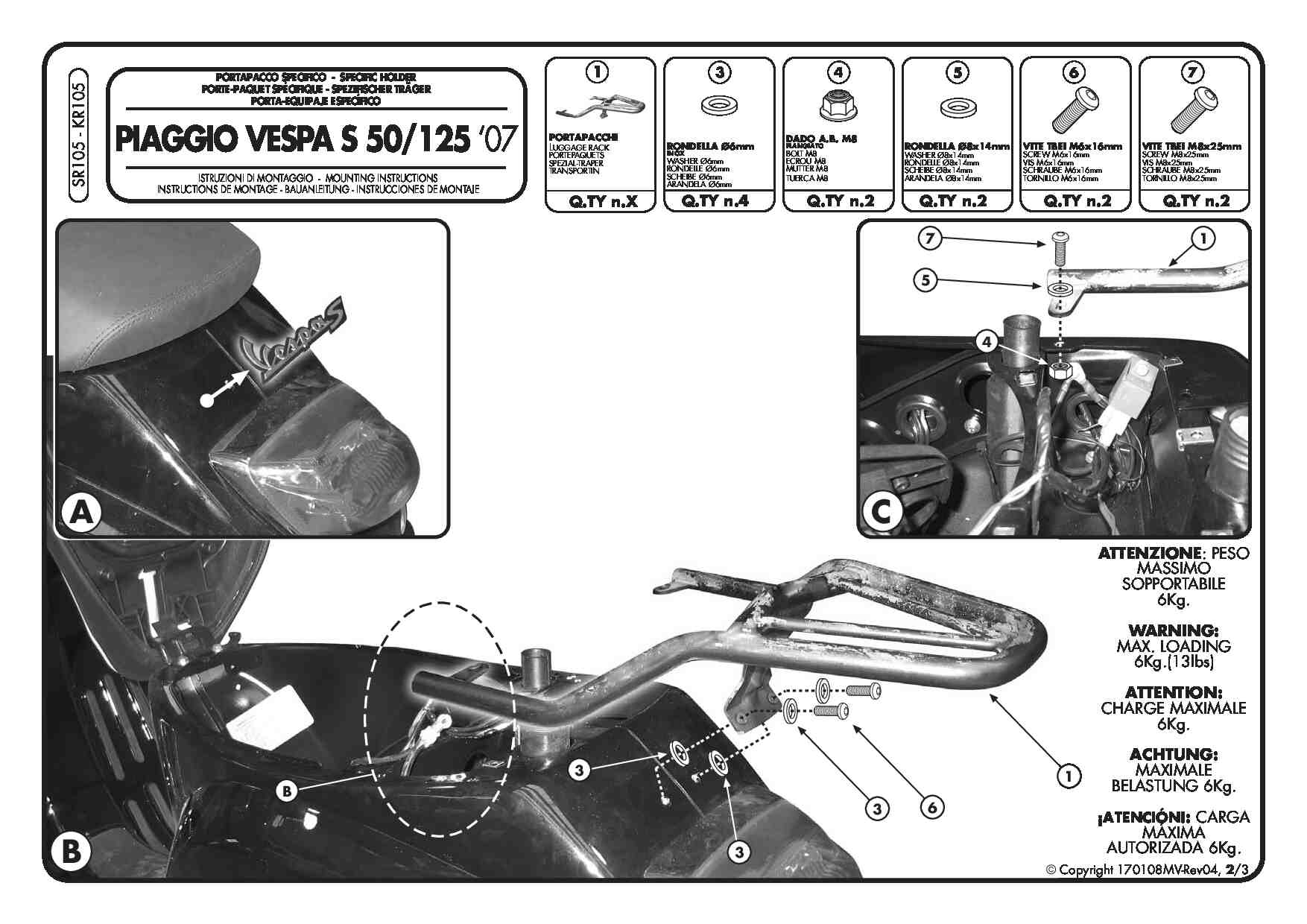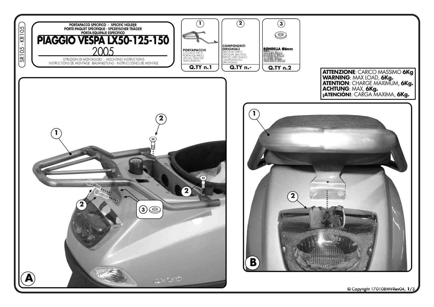 Stelaż kufra centralnego Givi SR105 do motocykla Piaggio Vespa LX 50-125-150 (05-14) / Vespa S 50-125-150 (07-14)
