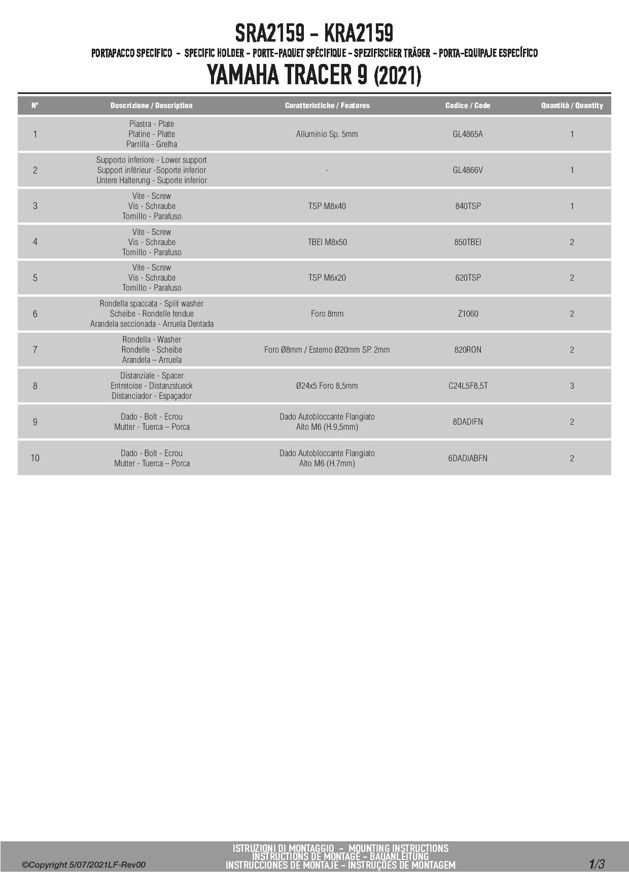 Stelaż kufra centralnego Givi SRA2159 do motocykla Yamaha Tracer 9 / GT / GT+ (21-24)