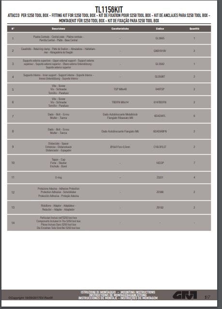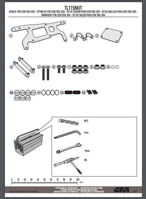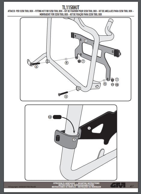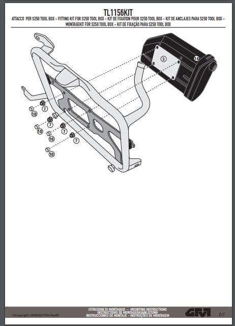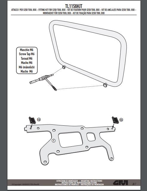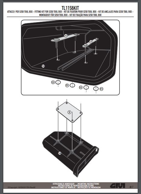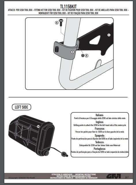 Specjalny zestaw TL1156KIT do montażu skrzynki narzędziowej S250 Tool Box na stelażu bocznym Givi PL5126 / PL1156 / PL1158.
