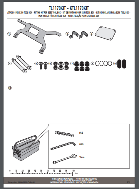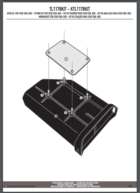 Specjalny zestaw TL1178KIT do montażu skrzynki narzędziowej S250 Tool Box na stelażu bocznym Givi PLO1178MK oraz PLO1178CAM.