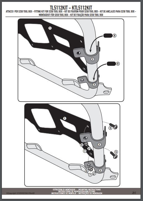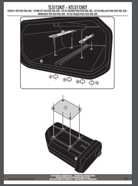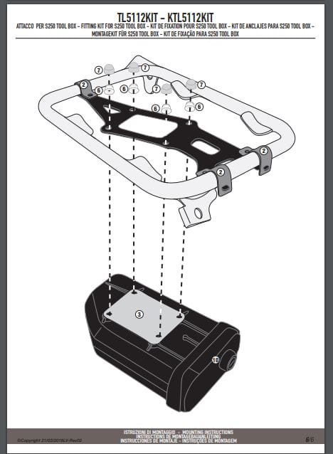 Specjalny zestaw TL5112KIT do montażu skrzynki narzędziowej S250 Tool Box na oryginalnym stelażu bocznym BMW dostępnym jako opcja u producenta.