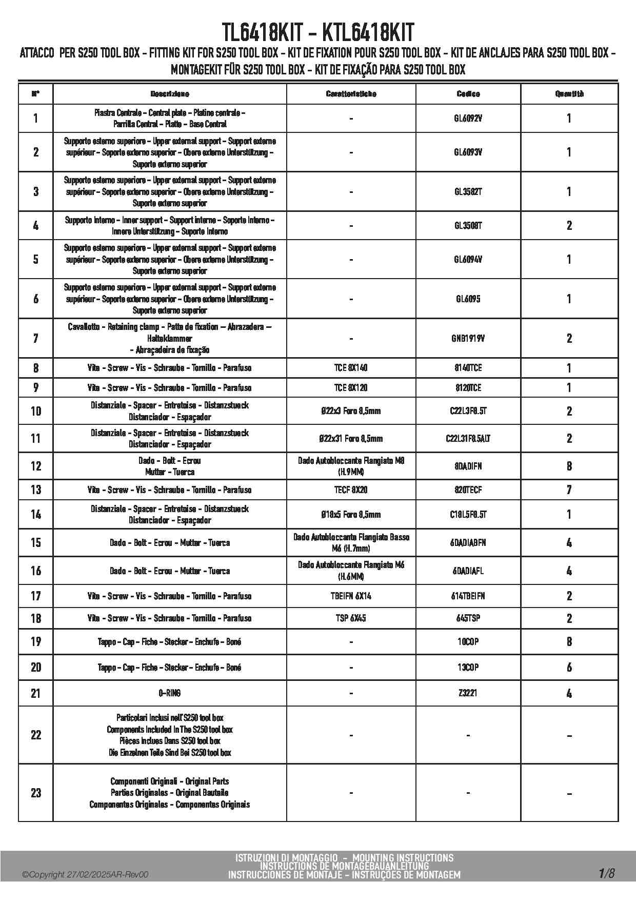 Specjalny zestaw TL6418KIT do montażu skrzynki narzędziowej S250 Tool Box na oryginalnym stelażu bocznym Triumpha, który jest opcjonalnym wyposażeniem motocykla.