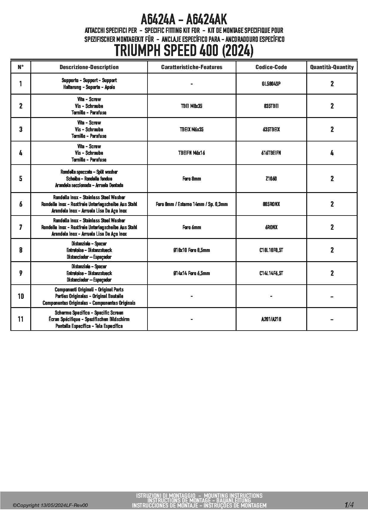 Dedykowany kit montażowy, który umożliwia zamontowanie szyby Kappa KA201 na motocyklu Triumph Speed 400.