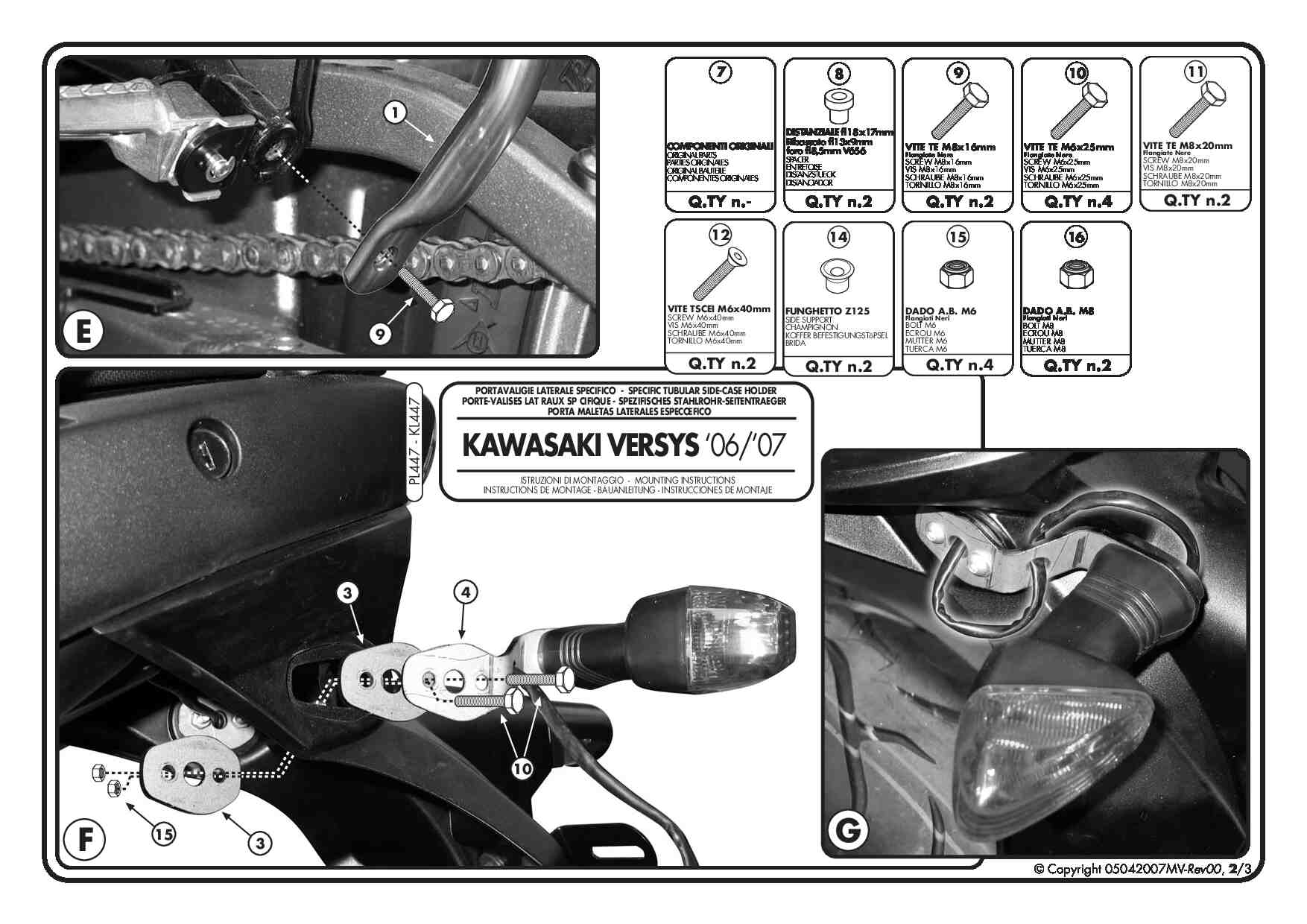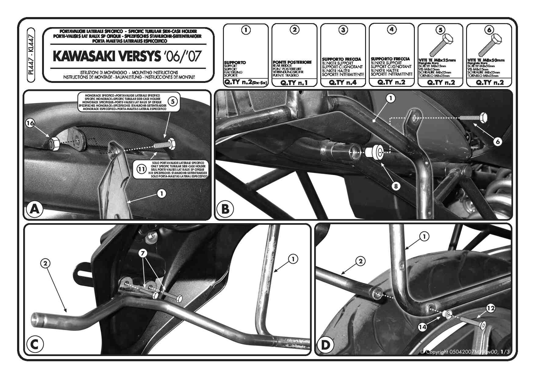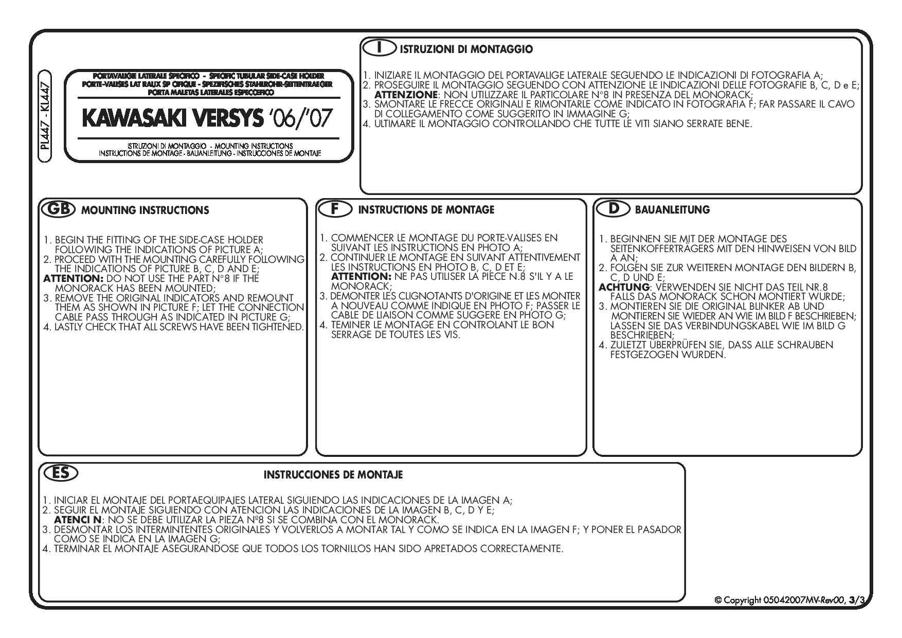 Do zamontowania potrzebny jest stelaż centralny KZ447 lub zestaw mocujący KLX447KIT (brak w zestawie). Należy zmienić pierwotną pozycję kierunkowskazów.