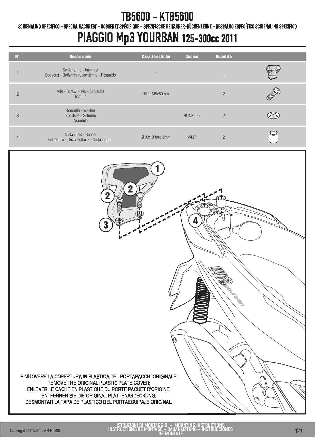 Kappa KTB5600 Oparcie dla pasażera Piaggio MP3 Yourban 125-300 / Mp3 300 HPE
