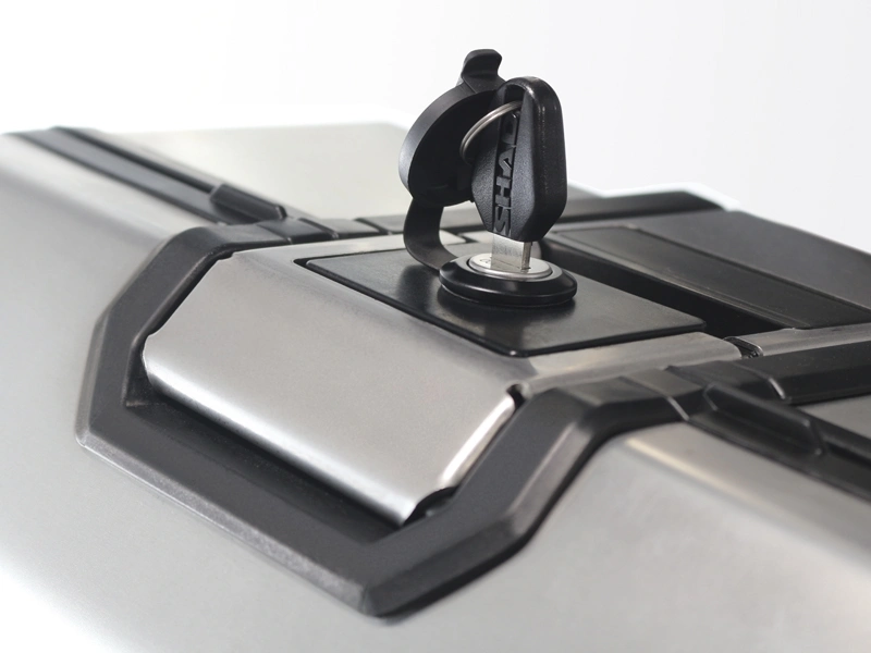 Kufer posiada zamek premium z systemem zmniejszającym ryzyko kradzieży oraz osłoną przeciwpyłową. Kupując aluminiowe kufry boczne SHAD do swojego motocykla, otrzymasz w zestawie wkładkę zamka przeznaczoną do montażu w kufrze centralnym. Takie rozwiązanie pozwala na obsługę całego zestawu jednym kluczykiem, co w trakcie podróży jest niezwykle wygodne.
