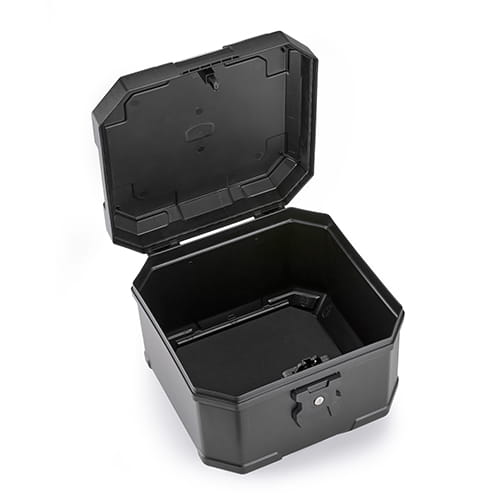 Kufer wyposażony jest w system CRABLOCK, który umożliwia szybkie otwieranie i zamykanie poprzez lekkie naciśnięcie pokrywy po przekręceniu kluczyka. System szybkiego demontażu z wewnętrznym przyciskiem bezpieczeństwa pozwala zdjąć kufer z płyty tylko po otwarciu pokrywy, zapobiegając przypadkowemu odpięciu. W zestawie znajduje się płyta montażowa Monolock oraz uniwersalny zestaw mocujący.