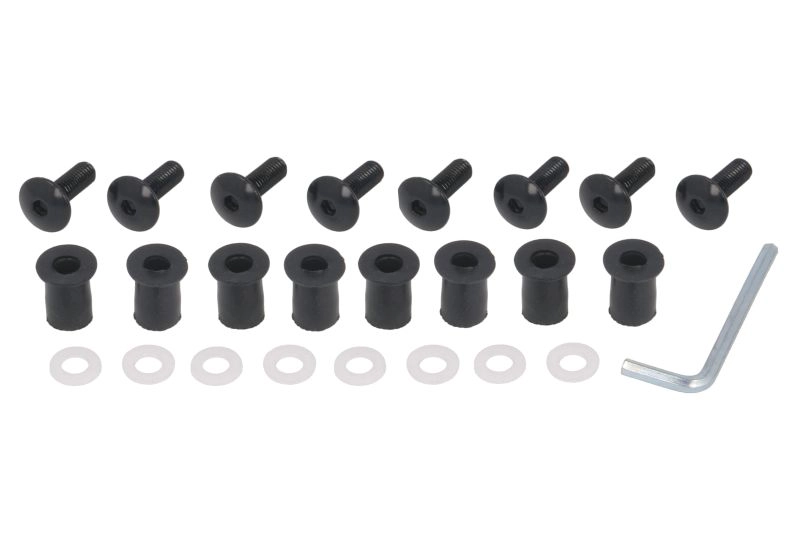 Śrubki montażowe z gumkami do montażu owiewek i szyb motocyklowych. Zestaw zawiera 8 śrub, gumowe kołki mocujące z gwintem, podkładki plastikowe, kluczyk 4mm.