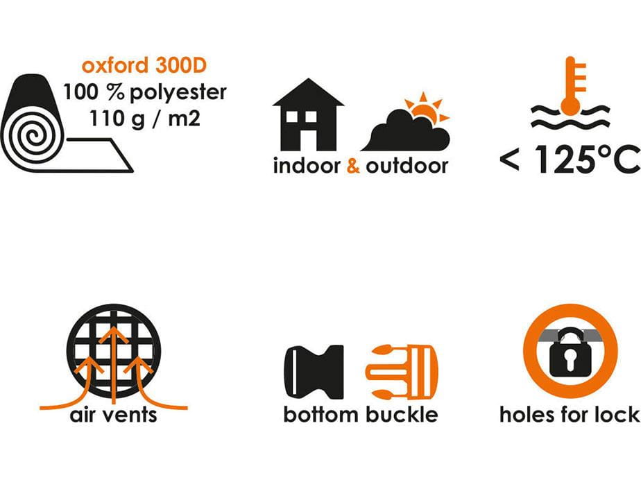 Wodoodporne pokrowce motocyklowe marki eXtremestyle uszyte są z wysokiej jakości materiału Oxford 300D, wykonanego w 100% z poliestru o gramaturze 110 g/m², odpornego na temperaturę do 125°C. Pokrowce posiadają otwory wentylacyjne, ściągacze, paski z klamrą oraz otwory na blokadę.