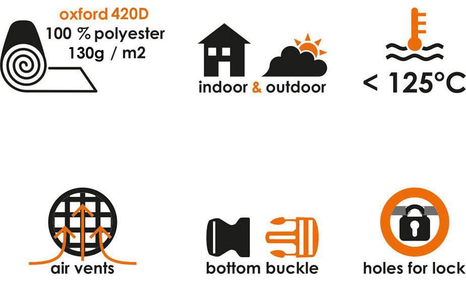 Wodoodporne pokrowce motocyklowe marki eXtremestyle uszyte są z wysokiej jakości materiału Oxford 420D, wykonanego w 100% z poliestru o gramaturze 130 g/m², odpornego na temperaturę do 125°C. Pokrowce posiadają: otwory wentylacyjne, ściągacze, paski z klamrą i otwory na blokadę.