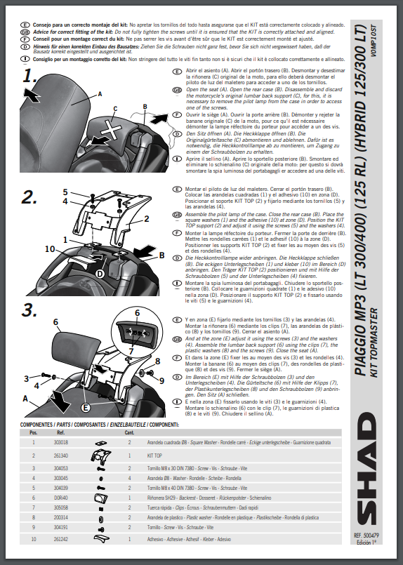 Stelaż pod kufer centralny SHAD V0MP10ST - Piaggio MP3 125-250-300-400 (07-21) / MP3 500 (11-21) / MP3 500i Sport (10) / MP3 Hybrid 125/300 LT / MP3 RL (07-21)