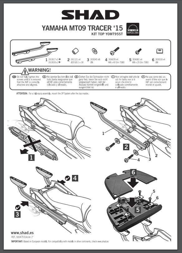Aby zamontować kufer centralny na motocyklu, wystarczy przymocować do stelaża centralnego specjalnie przygotowaną płytę montażową, która zawsze jest dołączona do kufrów marki SHAD wykonanych z tworzywa sztucznego. Należy jednak dodać, że seria kufrów aluminiowych Terra stanowi wyjątek, w przypadku którego płytę montażową trzeba dokupić osobno. Płyty montażowe również są dostępne w naszej ofercie.