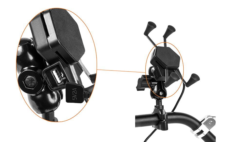 Uchwyt posiada uniwersalną ładowarkę USB o natężeniu 3.1 A. Wyjście USB jest zabezpieczone gumową zaślepką chroniącą przed kurzem i wodą oraz wyposażone w biały wyłącznik, umożliwiający odcięcie zasilania, gdy uchwyt nie jest używany.