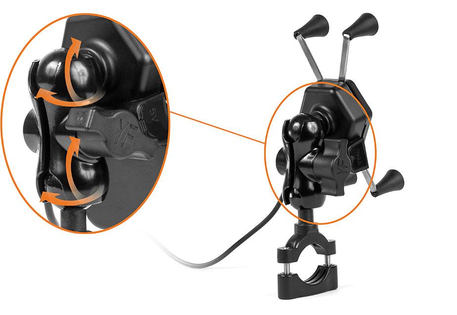 Obrotowy przegub głowicy umożliwia ustawienie telefonu w pionie i poziomie oraz zmianę kąta nachylenia względem kierownicy. Przeguby kulowe są pokryte warstwą twardej gumy, która zapobiega zmianie pozycji podczas jazdy.