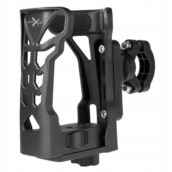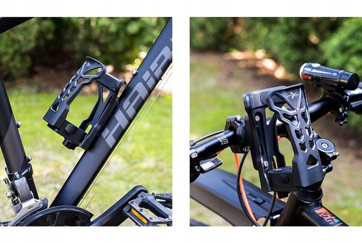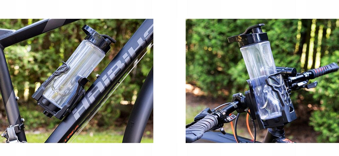 Głowica uchwytu jest przystosowana do trzymania różnego rodzaju bidonów, butelek, kubków i termosów.