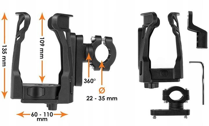 Dzięki uniwersalnemu mocowaniu, uchwyt nadaje się do motocykli, quadów, rowerów, skuterów, hulajnóg, wózków dziecięcych oraz wszelkich innych przedmiotów posiadających rurkę o średnicy 22 - 35 mm.