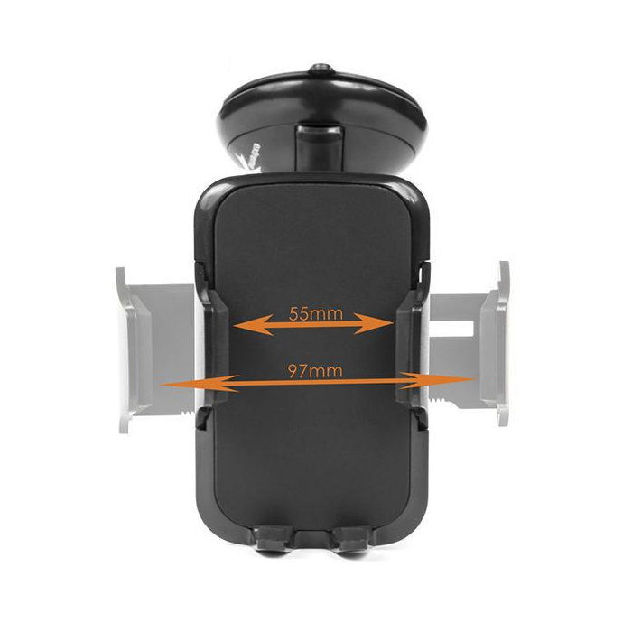 Kulowe połączenie głowicy z mocowaniem do szyby umożliwia ustawienie telefonu zarówno w poziomie jak i w pionie.