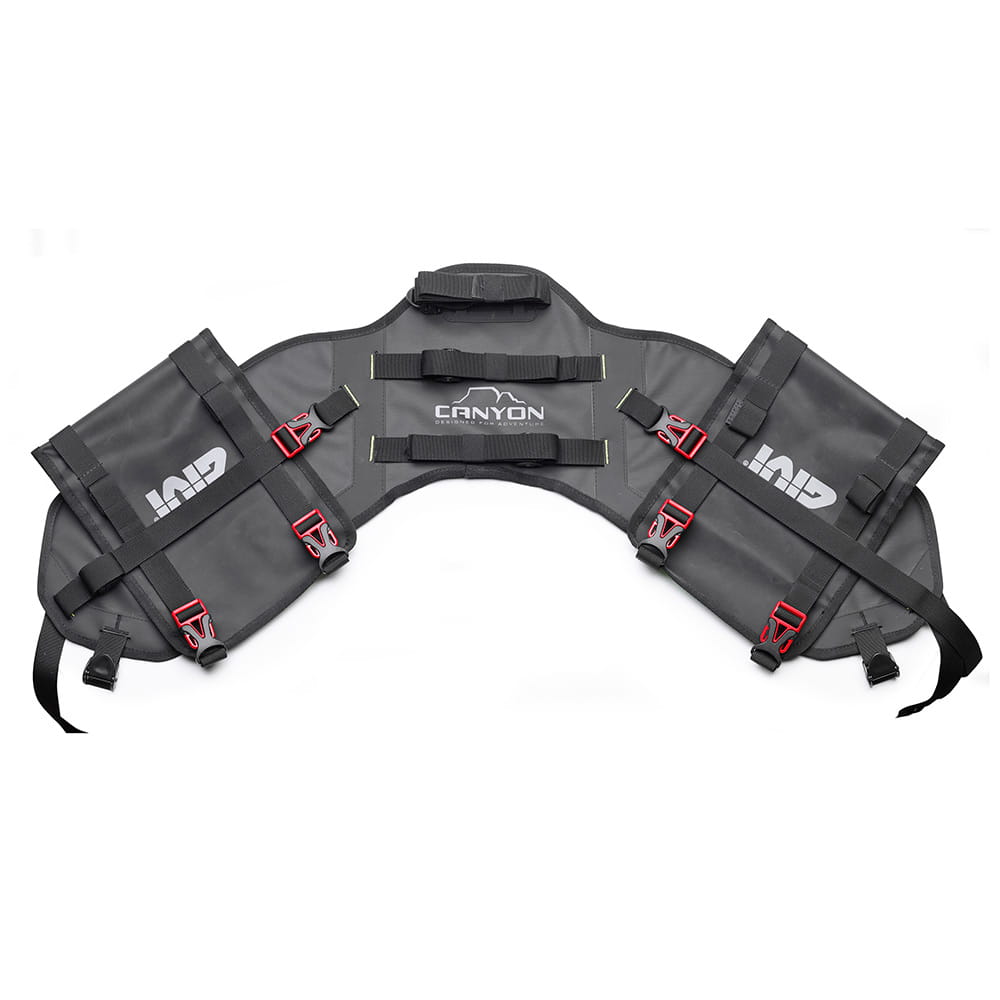 - Boczne klapy pokryte hypalonem, z paskami do mocowania toreb pozwalają na utrzymanie ładunku i chronią torby w przypadku upadku