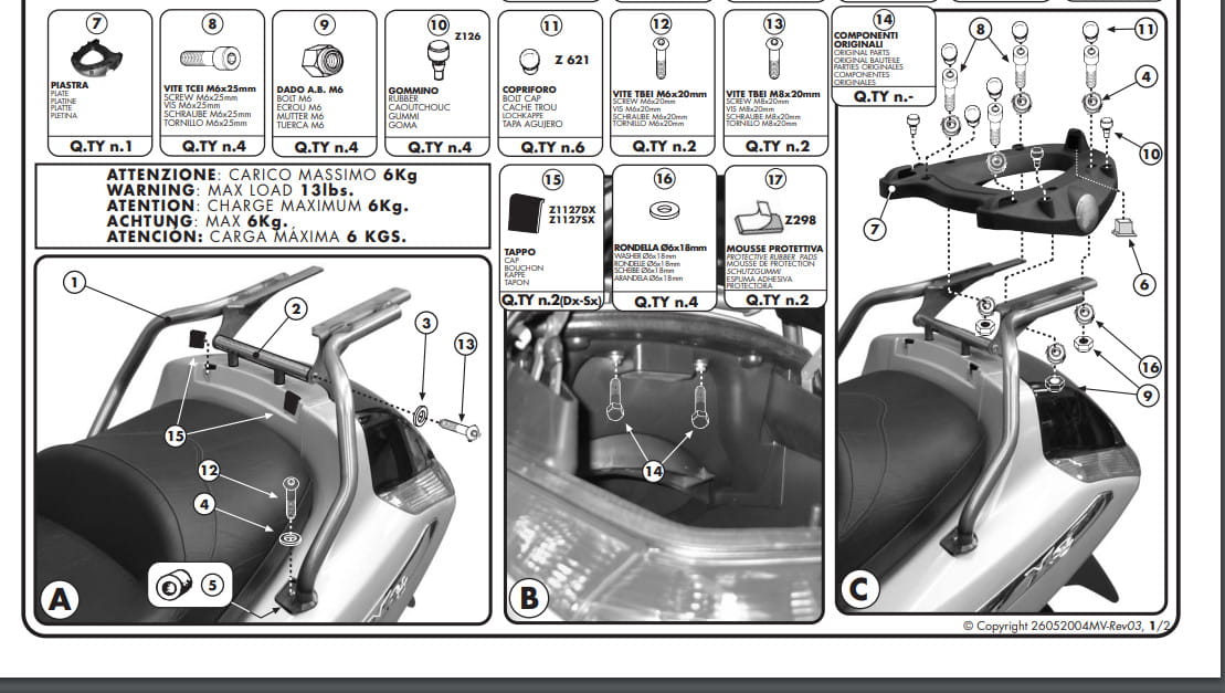 Stelaż kufra centralnego Givi SR102 do skutera Piaggio X8 125-150-200-250-400 (04-10) / X-Evo 125-250-400 (07-11)