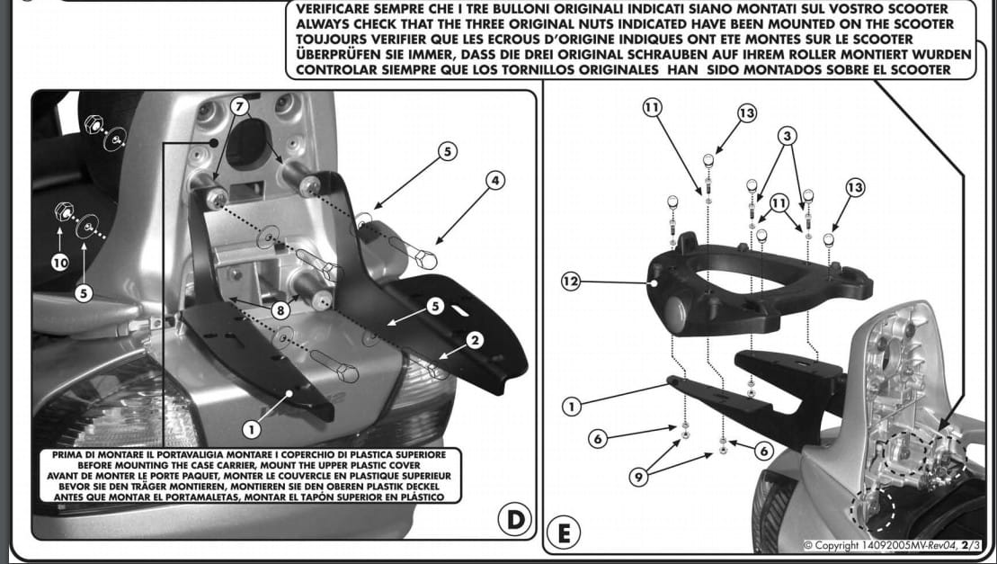 Trzy punkty mocowania składające się z noska (większego niż w rozwiązaniu MONOLOCK) i dwóch grzybków. W przypadku płyt wykonanych z tworzywa sztucznego nośność to 10kg, paradoksalnie niby mocniejsze aluminiowe płyty mają wytrzymałość określoną przez producenta na 6kg. Uzasadnione jest to pracą materiału i odbieraniem/pochłanianiem energii drgania - tworzywo sztuczne, z którego są wykonane płyty Givi chłonie tą energię bardziej przez co jest uznawane za trwalsze. Mimo wszystko płyta aluminiowa bardzo mocno nadrabia wyglądem i często na motocyklu z wypiętym kufrem wygląda jak "biżuteria". Pamiętajmy również, że są to zalecenia producenta - warto skonfrontować te surowe dane techniczne z naszą słowiańską intuicją techniczną :)