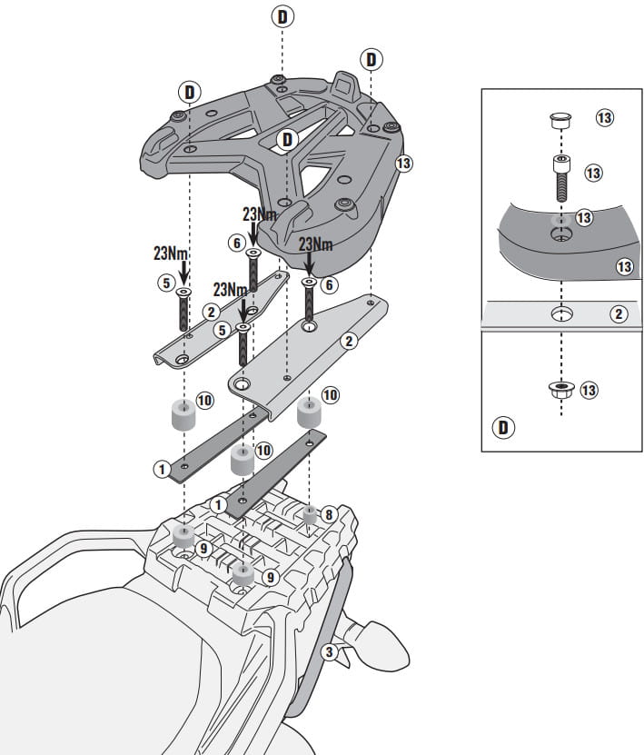 Trzy punkty mocowania składające się z noska (większego niż w rozwiązaniu MONOLOCK) i dwóch grzybków. W przypadku płyt wykonanych z tworzywa sztucznego nośność to 10kg, paradoksalnie niby mocniejsze aluminiowe płyty mają wytrzymałość określoną przez producenta na 6kg. Uzasadnione jest to pracą materiału i odbieraniem/pochłanianiem energii drgania - tworzywo sztuczne, z którego są wykonane płyty Givi chłonie tą energię bardziej przez co jest uznawane za trwalsze. Mimo wszystko płyta aluminiowa bardzo mocno nadrabia wyglądem i często na motocyklu z wypiętym kufrem wygląda jak "biżuteria". Pamiętajmy również, że są to zalecenia producenta - warto skonfrontować te surowe dane techniczne z naszą słowiańską intuicją techniczną :)