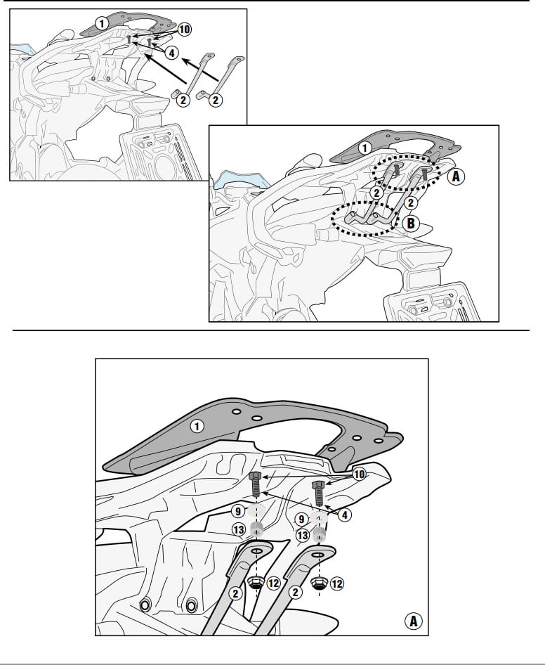 Trzy punkty mocowania składające się z noska (większego niż w rozwiązaniu MONOLOCK) i dwóch grzybków. W przypadku płyt wykonanych z tworzywa sztucznego nośność to 10kg, paradoksalnie niby mocniejsze aluminiowe płyty mają wytrzymałość określoną przez producenta na 6kg. Uzasadnione jest to pracą materiału i odbieraniem/pochłanianiem energii drgania - tworzywo sztuczne, z którego są wykonane płyty Givi chłonie tą energię bardziej przez co jest uznawane za trwalsze. Mimo wszystko płyta aluminiowa bardzo mocno nadrabia wyglądem i często na motocyklu z wypiętym kufrem wygląda jak "biżuteria". Pamiętajmy również, że są to zalecenia producenta - warto skonfrontować te surowe dane techniczne z naszą słowiańską intuicją techniczną :)