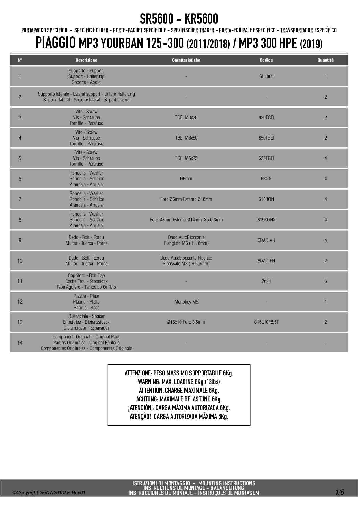 Givi SR5600 Stelaż kufra centralnego Piaggio MP3 Yourban 125-300 (11-18) / MP3 300 HPE (19-24) z płytą MONOKEY
